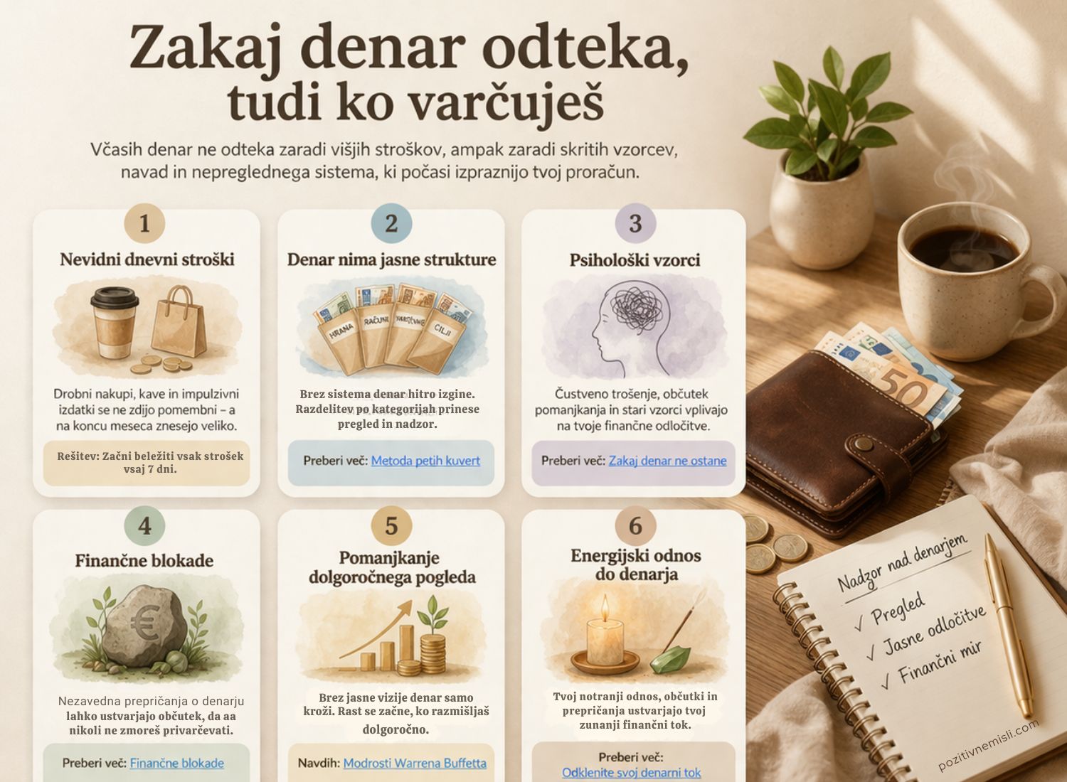 To ustvarja frustracijo, dvome in občutek, da “nekaj ne deluje”, čeprav se trudiš. Še težje je, ker problem ni vedno očiten. Ni ene velike napake – ampak več majhnih, ki skupaj ustvarijo občutek finančnega odtekanja.